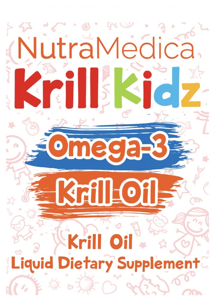 Specifications: 150 ml Nutramedica Krill Kidz Syrup in a glass bottle in a box with a dosage cup.